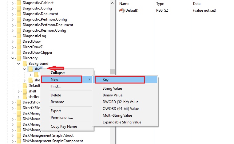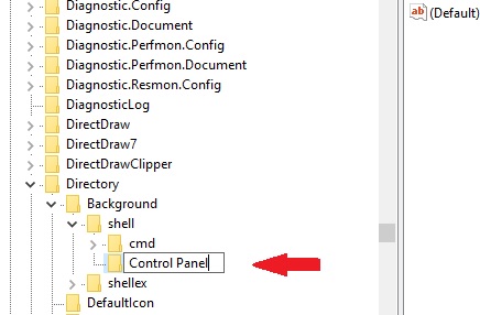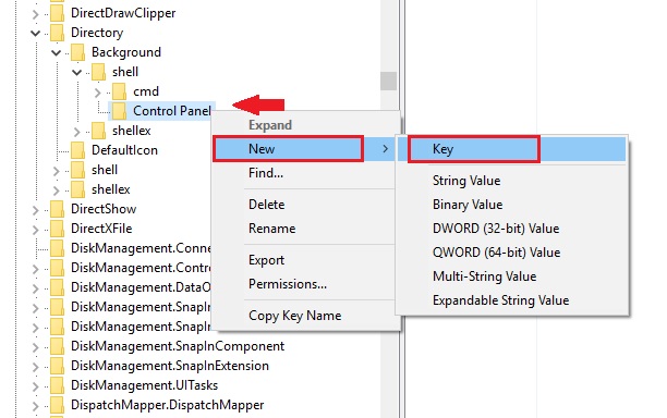 Now, right-click on the shell key and select New > Key. Name the key Control Panel.