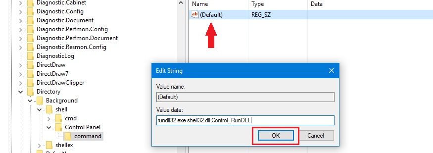 Step 4. On the right side, double click on (Default) and an Edit String dialog box will appear on your screen. Enter the following command under the Value data box: