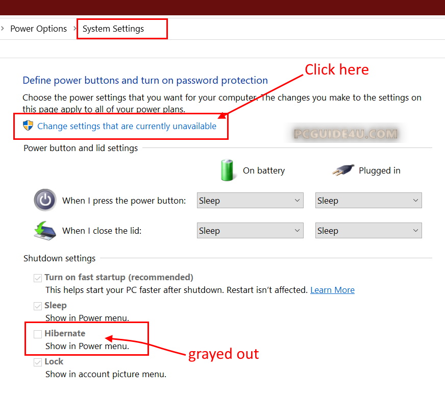 Hibernate won’t be available in this list as it is disabled by default in Windows 10.