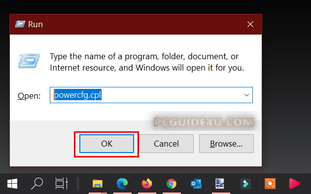Type powercfg.cpl and OK or press Enter from your keyboard to launch Power Options setting under control panel.