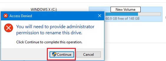 Step 3. As a result, an authentication window will be prompted. You will need to click Continue on this pop-up Access Denied dialog box to provide administrator permission to rename it.