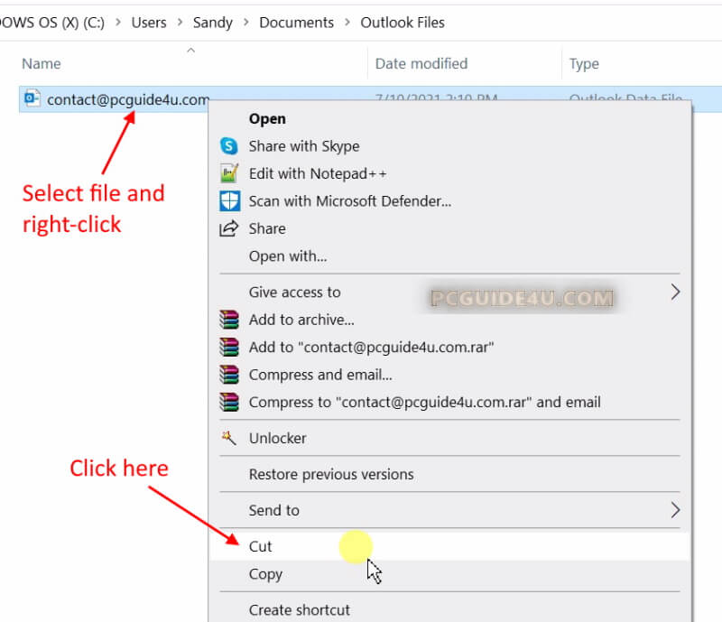 Step 6. The above action will take you directly to the folder wherein outlook .PST or .OST file is saved. Right-click on the data file and select the option Cut