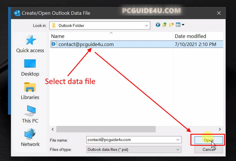 Step 2. A new window will open on your screen and ask you to Create/Open Outlook Data File.