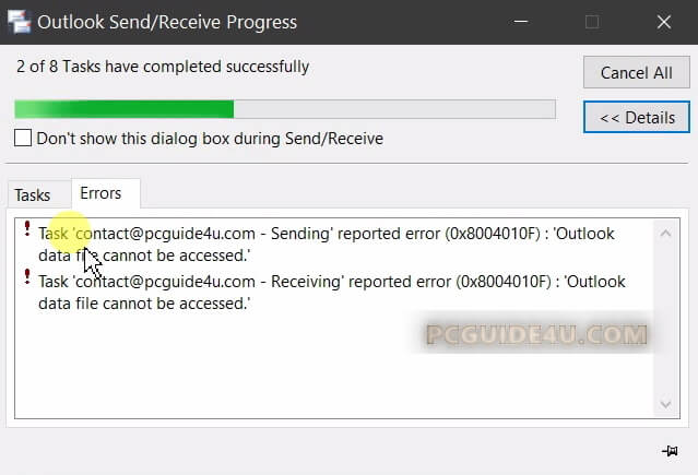 Step 3. Now, while doing a Send/Receive All Folder, you will have an error code for sure similarly below:
