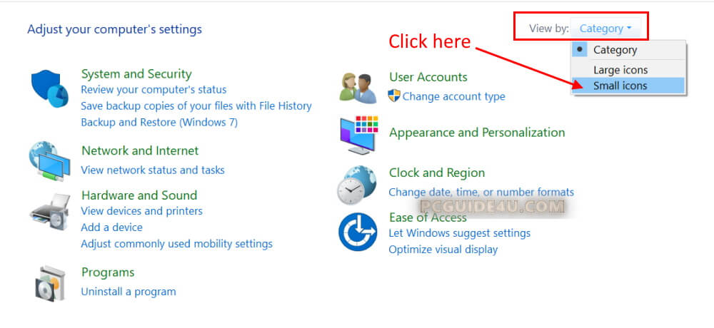 Step 2. Now from the right-top, change View by: Category to Small icons