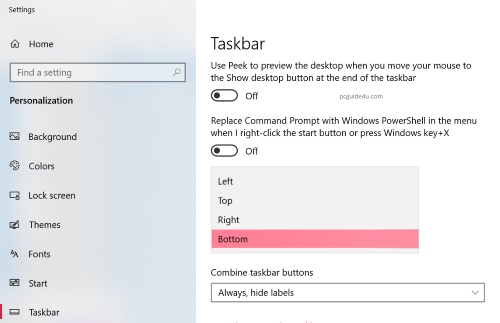 - It will directly open up the page where you will see an option for the Taskbar settings with a drop-down list of bottom, left, right and top