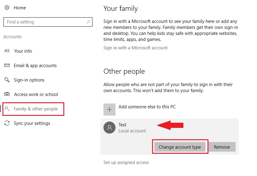 Step 3: On the left side, click on Family & Other people click on an account (i.e.: Test) under Other people or Your family you want to change the type of and click Change account type.