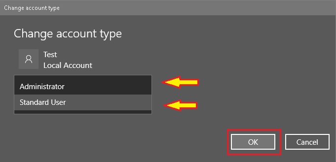 Final Step: Once you are done with the above steps. You will be prompted to select the account type you want to change the account to. Select the account type (Administrator/Standard User) and click on OK.