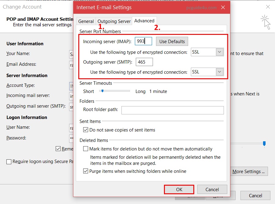 - Then, go to Advanced Tab and set the details as Incoming server (IMAP): 993 with SSL and Outgoing server (SMTP): 465 with SSL.