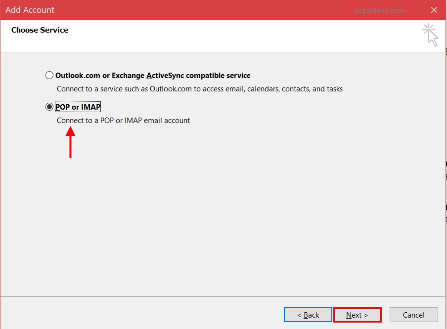 Step 3. Another screen will come up and select POP or IMAP and click on Next.