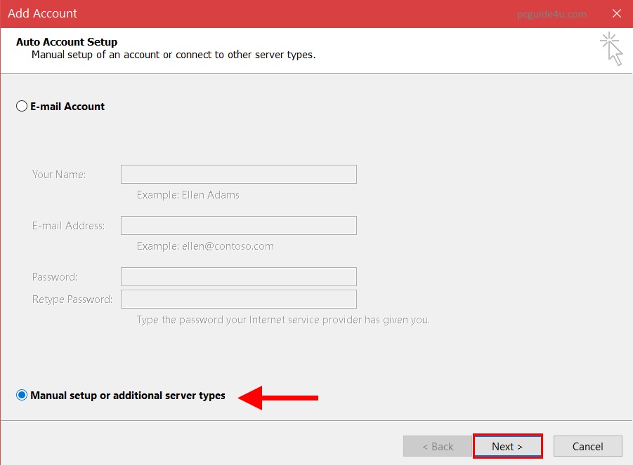 Select the radio button for Manual setup or additional server types and click the Next button given below.