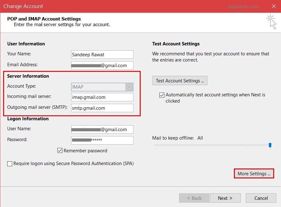 - Incoming email server: imap.gmail.com