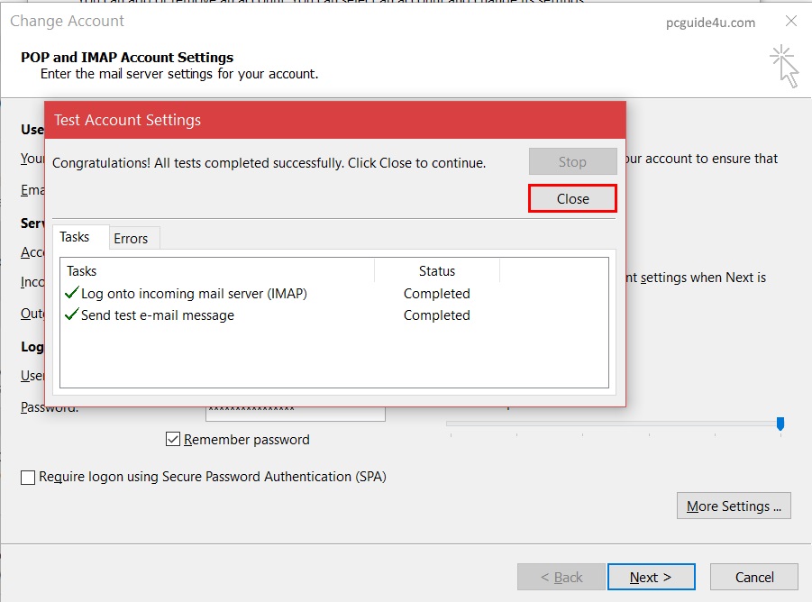 Step 6. Finally, click on the Next button and Microsoft outlook will test the account settings then show you the result as successful if the settings are done correctly.