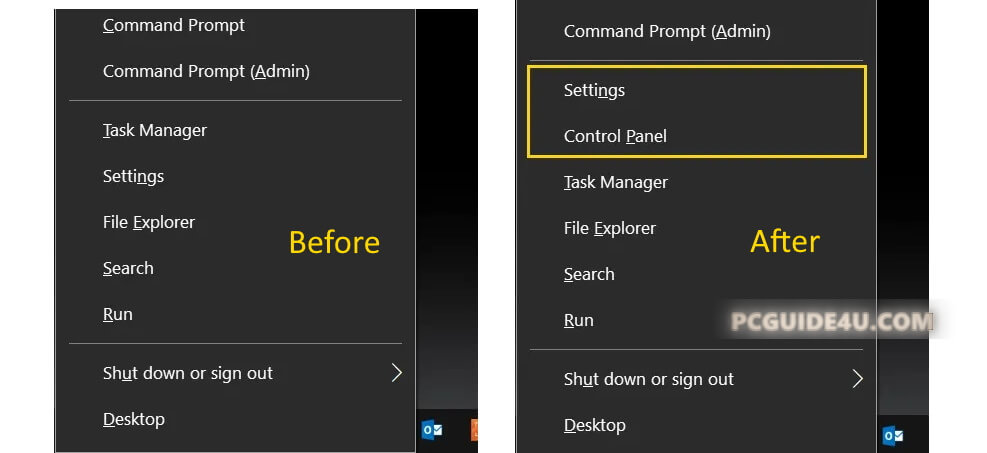 - Add and Access Control Panel from the Win + X Menu