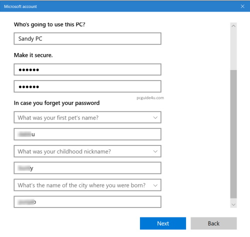 Step 5. Now, create an account for this PC by typing “User name” (Sandy PC in the below image as mine) and you can make it secure by using a password {make sure the password will be easy for you to remember but hard for others to guess} or continue without a password.