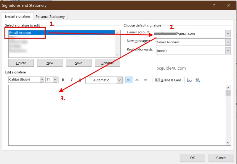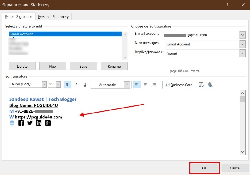 Step 4. It will take you to the previous screen Signatures and Stationery and you will see the signature name “Gmail Account” in the list.