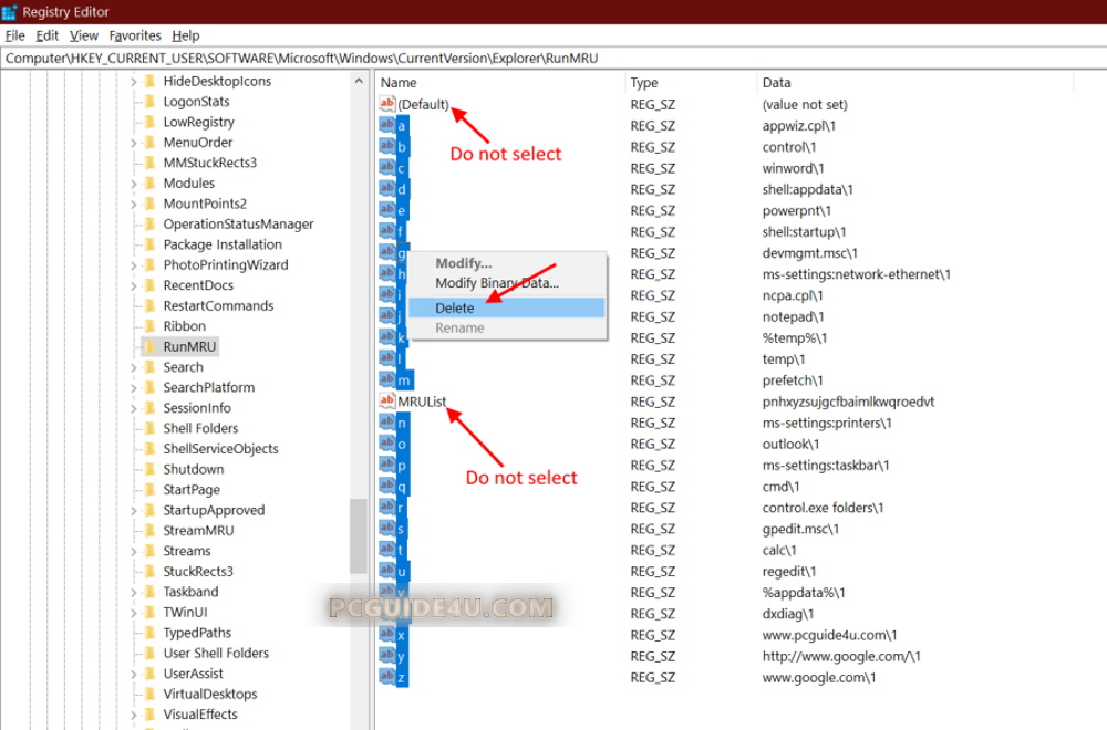 Caution: Make sure you don’t select MRUList and (Default) key values while performing the task below.