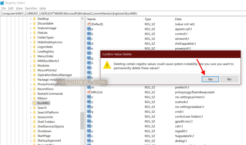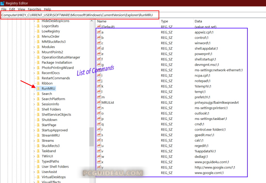Once you have selected RunMRU key, in the right pane, you will see a list of run commands that you have used in the run dialog box.
