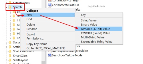 - Right-click on the Search folder and select New > DWORD (32-bit) Value.