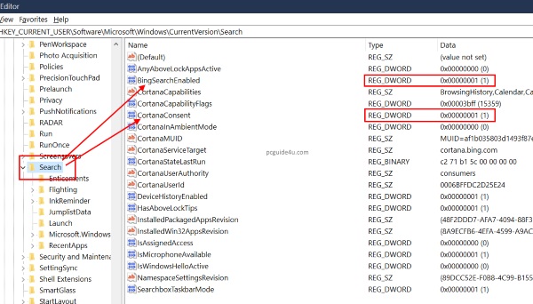 Step 3. While selecting the Search folder from the left pane. Look to the right side and locate BingSearchEnabled and CortanaConsent.