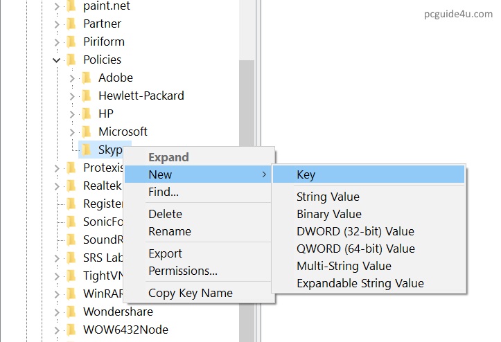 Then, right-click on Policies and select New -> Key -> name it Skype and hit enter.