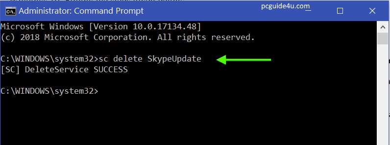 - A command prompt will open on your screen. Type sc delete SkypeUpdate and hit Enter from your keyboard.On the next line, you will see the message of SUCCESS. Close the command prompt screen.