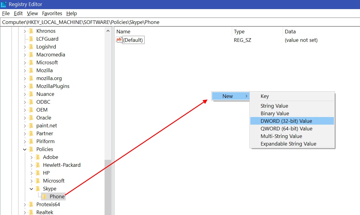 2) Now, right-click on the created Skype and select New -> Key -> name it Phone and hit enter. By doing this, the Phone will be added under Skype.