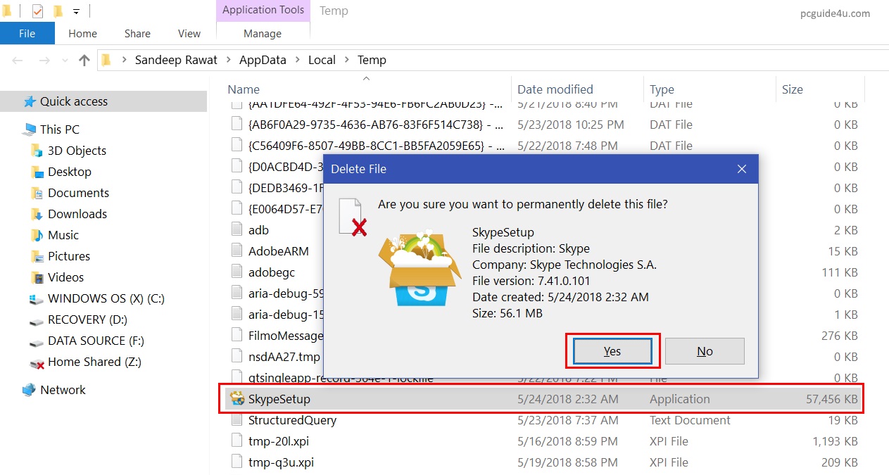 - Locate SkypeSetup.exe, select it and use the hot keys Shift + delete to delete this file permanently from your machine. Then, close the Windows Temp Folder.
