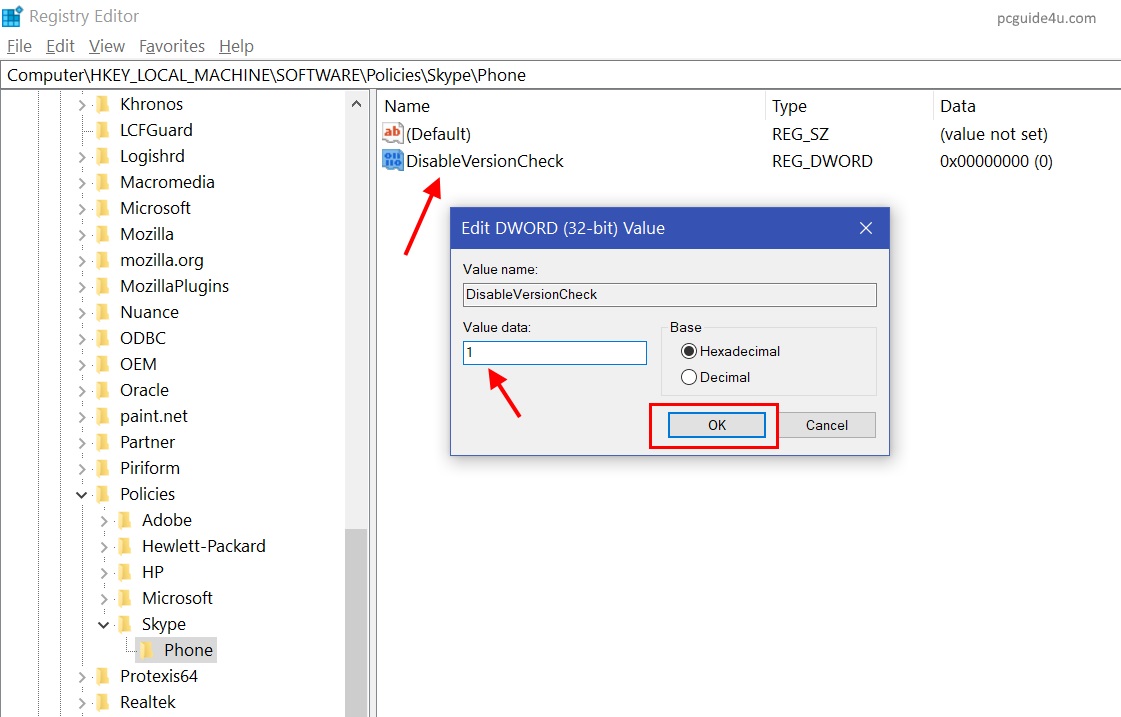 5) Now double click on DisableVersionCheck and change Value data: from 0 to 1 and click OK to close. Then you can close the Registry Editor.