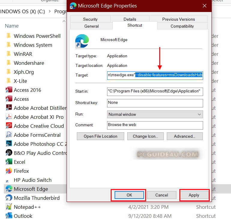 Go back to Microsoft Edge shortcut Properties and remove the added text from Target field and save the changes.