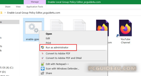 Step 3. Open the extracted folder by doing a double click and look for a file named ‘enable-gpedit’. Then, right click and select ‘Run as administrator’.