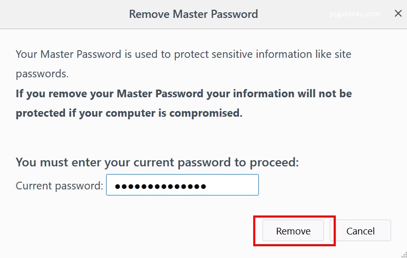 Keep in mind that if you remove this master password, any stored information will not be protected after removing this and accessible to everyone.