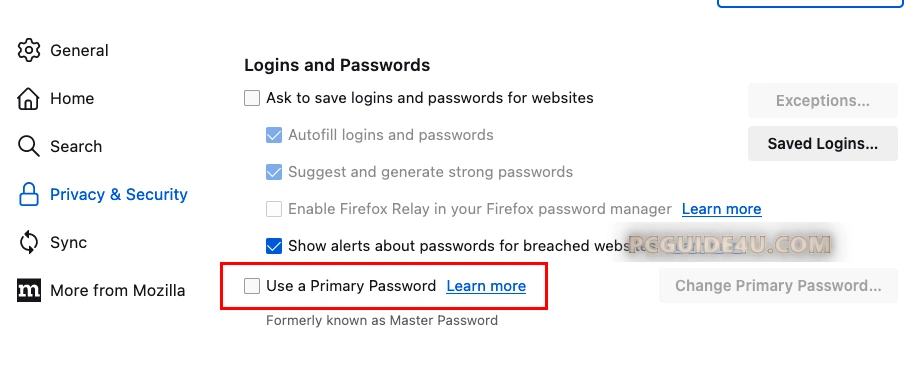 Step 3. On the right side under Logins and Passwords, you can see that there is an option and check-box to Use a Primary password.
