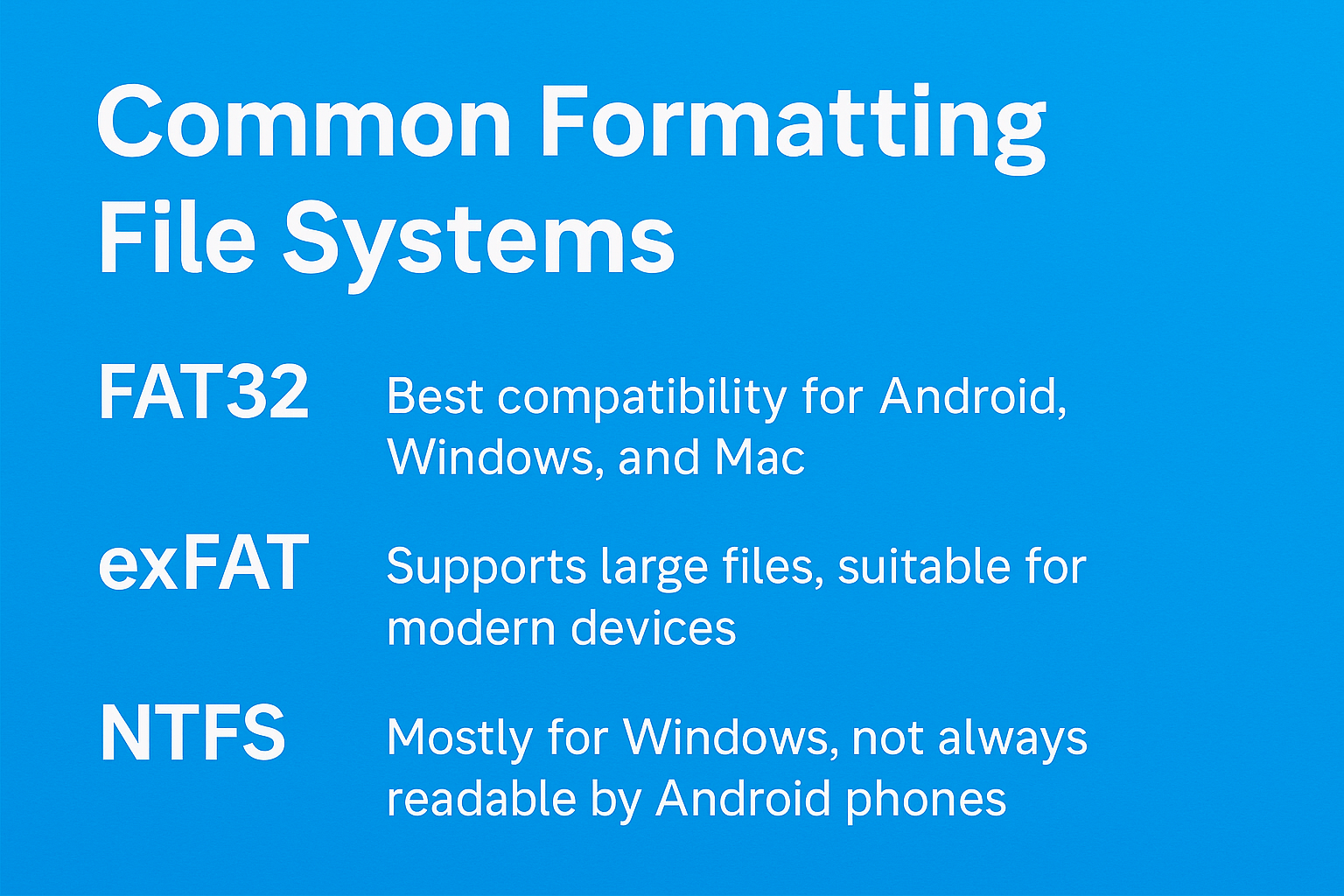- NTFS: Mostly for Windows, not always readable by Android phones.