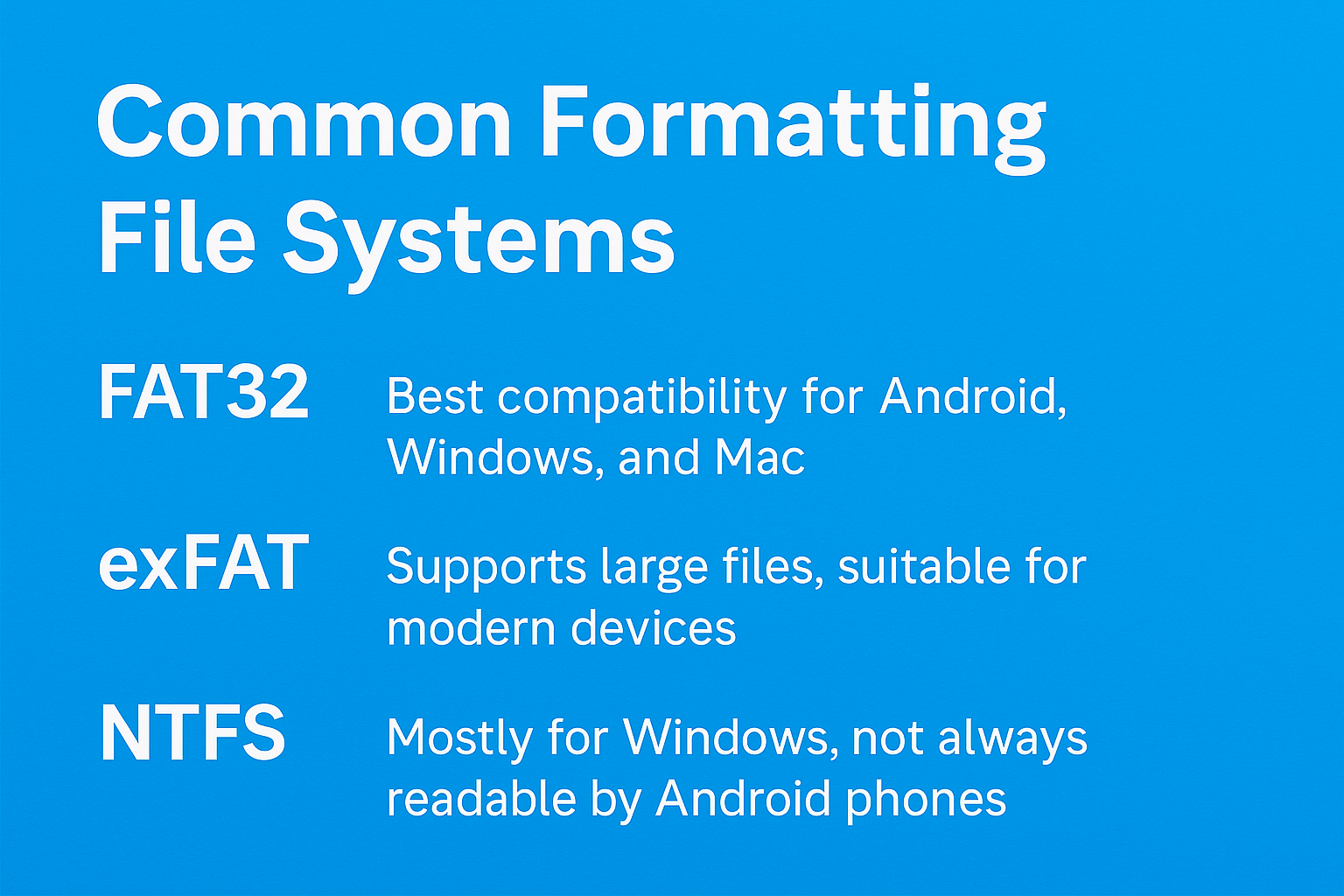 - NTFS: Mostly for Windows, not always readable by Android phones.