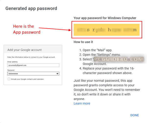 Step 4. Lastly, a screen will be prompted which shows “your app password for Windows Computer” which contains 16-digit character code.