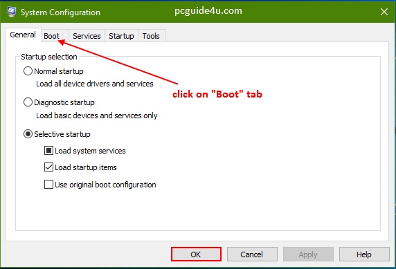 By default, it is on General Tab. Click on Boot Tab, as we need to work with boot option.