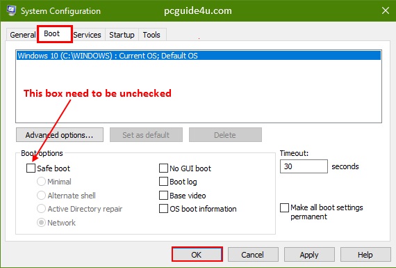 Step 4. Under the Boot Tab, you may see that there is a check mark on the Safe boot option. You need to uncheck the check box in order to get out from the safe mode loop.
