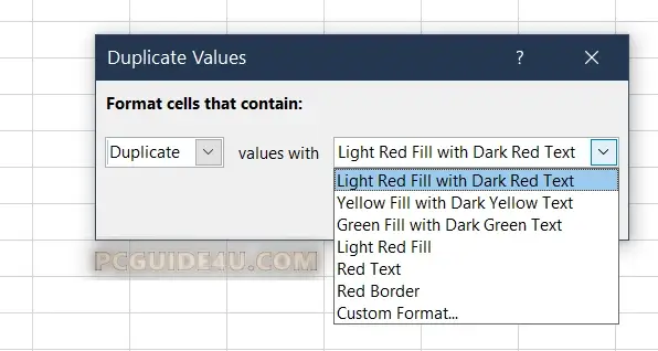 Step 4. Duplicate Values window will open on your screen. You can choose the color option from the drop-down list to highlight duplicate data values.