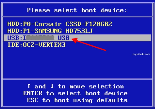 Select USB drive from the boot device list and hit Enter button to continue. If you won’t get, check system manufacture manual.