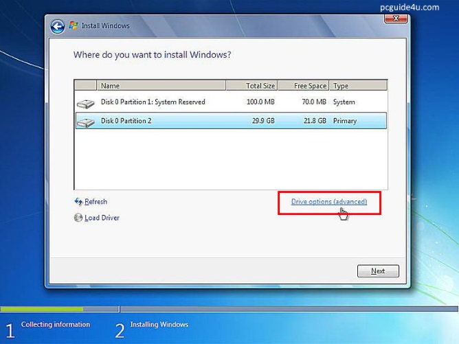 Step 8. It will show you the hard drive partitions. Click “Drive options (advanced)” from the right. This will expand the drive actions that we need to take on hard drive partition.