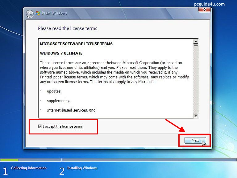 Step 6. Now wait for a few seconds, the Windows setup process is starting. Next screen comes is a textbox containing the Windows 7 Software License terms agreement (scroll and read it). Tick mark the checkbox “I accept the license terms” and click “Next” to continue.
