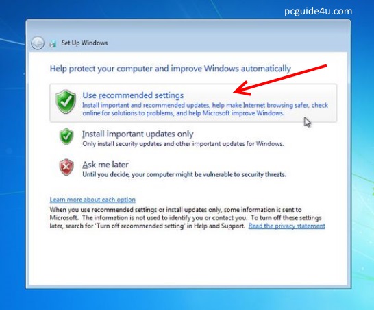 Step 14. On the next screen, Windows will ask you to select “Windows update” options. Select “Use recommended settings” and follow the rest of the on screen option i.e time and date settings, network selection (if basic network driver installed automatically) and select an appropriate one.
