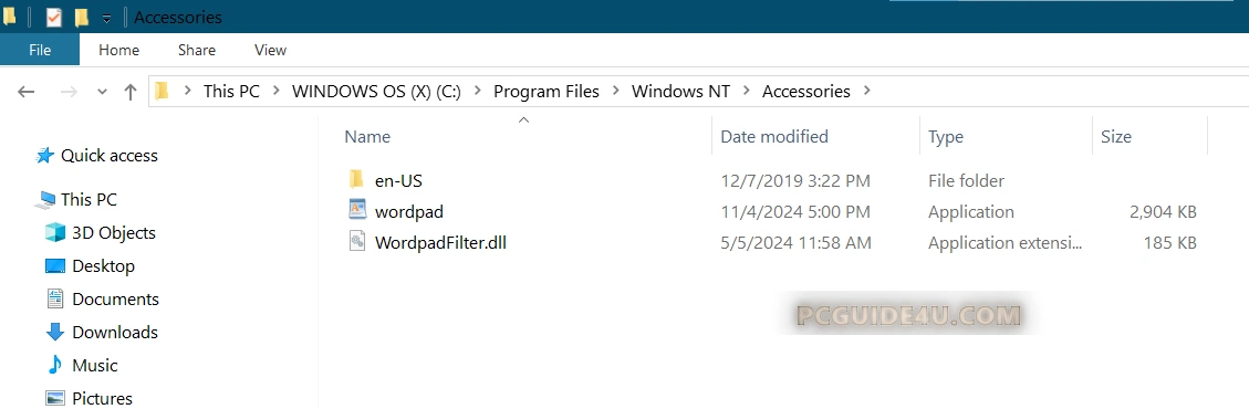 - Navigate to the following path: C:\Program Files\Windows NT\Accessories, in a Windows 11 version 23H2 or older version of a Windows machine
