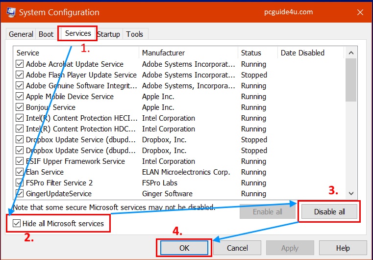 - Now, go to the Services Tab and to the bottom left, check the box to Hide all Microsoft services and then click on Disable all to the right.