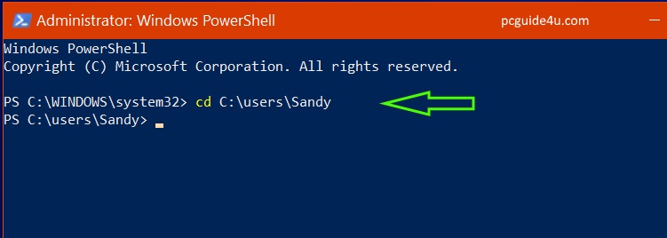 - Windows PowerShell will be opened on your screen.Type the command cd C:\users\yourusername (replace your username with your user account name, as mine Sandy in below image)