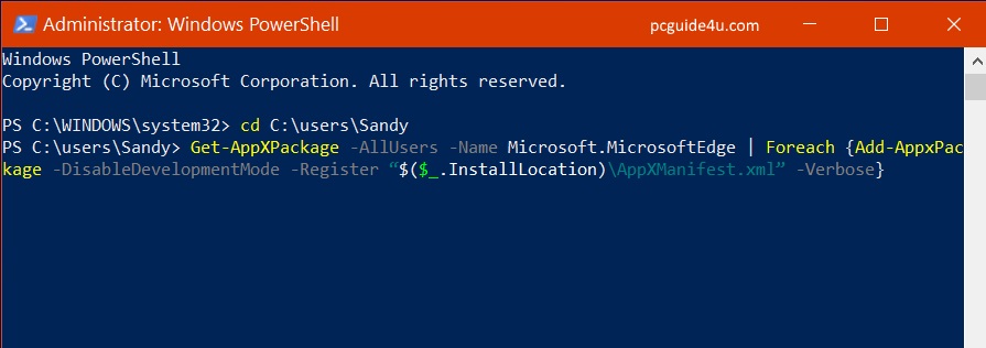Get-AppXPackage -AllUsers -Name Microsoft.MicrosoftEdge | Foreach {Add-AppxPackage -DisableDevelopmentMode -Register “$($_.InstallLocation)\AppXManifest.xml” -Verbose}