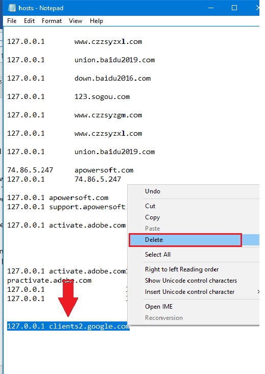You need to find 127.0.0.1 clients2.google.com. Then select and delete.