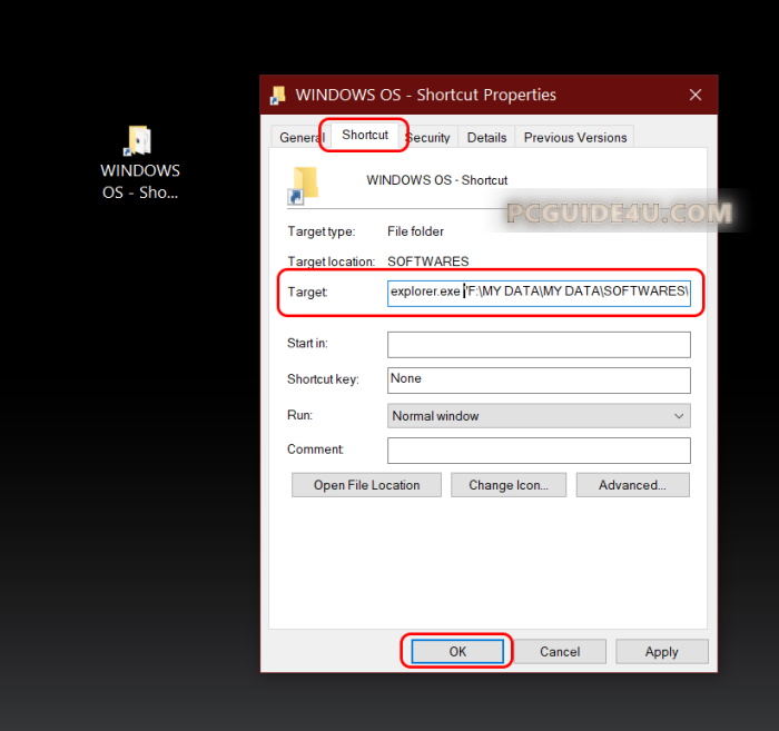 "F:\MY DATA\MY DATA\SOFTWARES\WINDOWS OS" Change to explorer.exe "F:\MY DATA\MY DATA\SOFTWARES\WINDOWS OS"