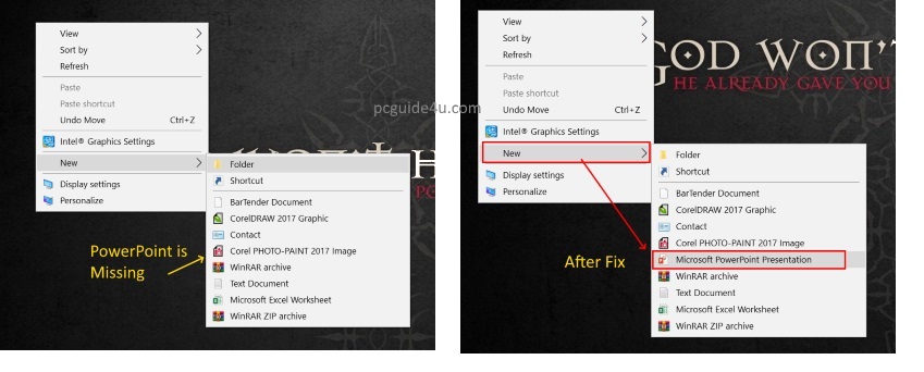 Apparently, you might have lost the Microsoft PowerPoint Presentation option from the “New” right-click context menu. If the PowerPoint option is missing or Word is missing from your Windows right-click menu, that means somehow the Windows registry is modified.